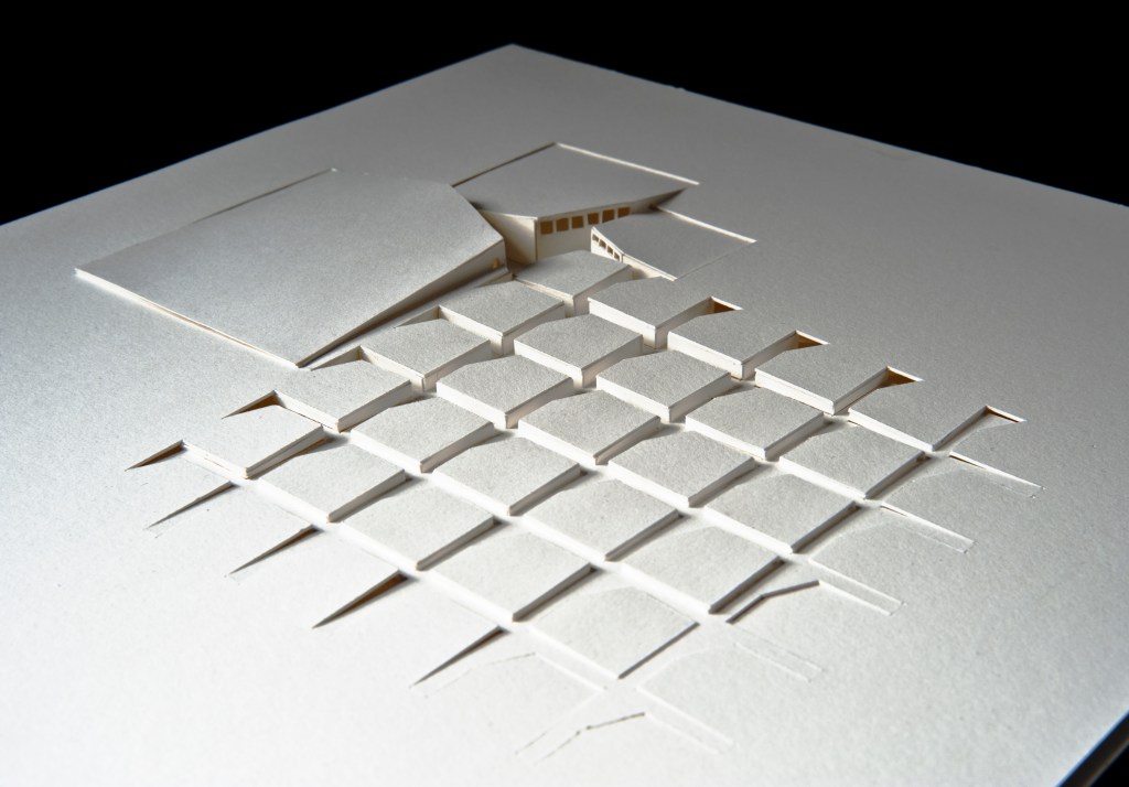 Each successively smaller room has a lower roof, and the smallest squares that form the 6×6 matrix are flat and merge into the ground level. However, the space between them slopes downward toward the center of the spiral forming a second ground – the final punctuation, a reflection of two worlds that meet in the middle between light and darkness, the known and the unknown.