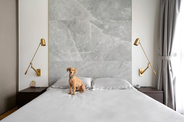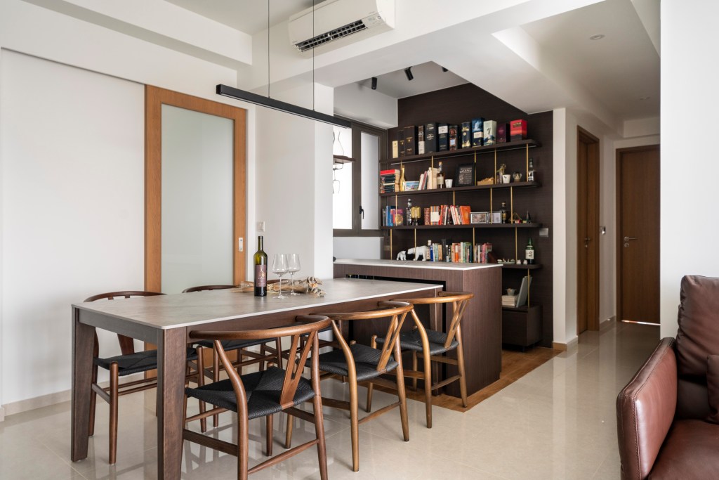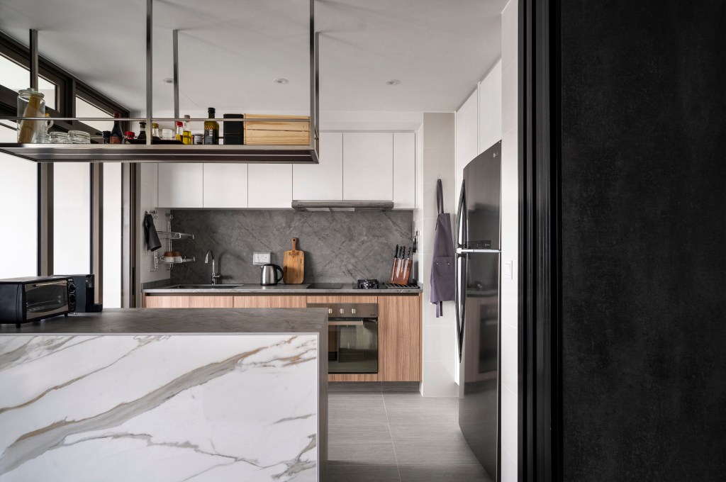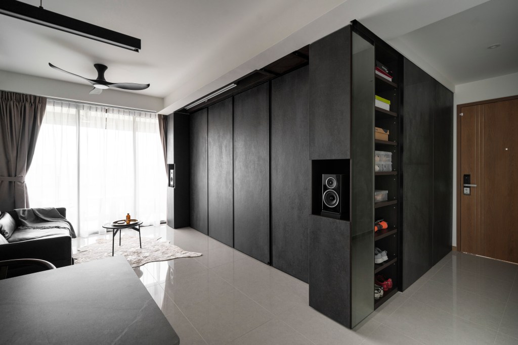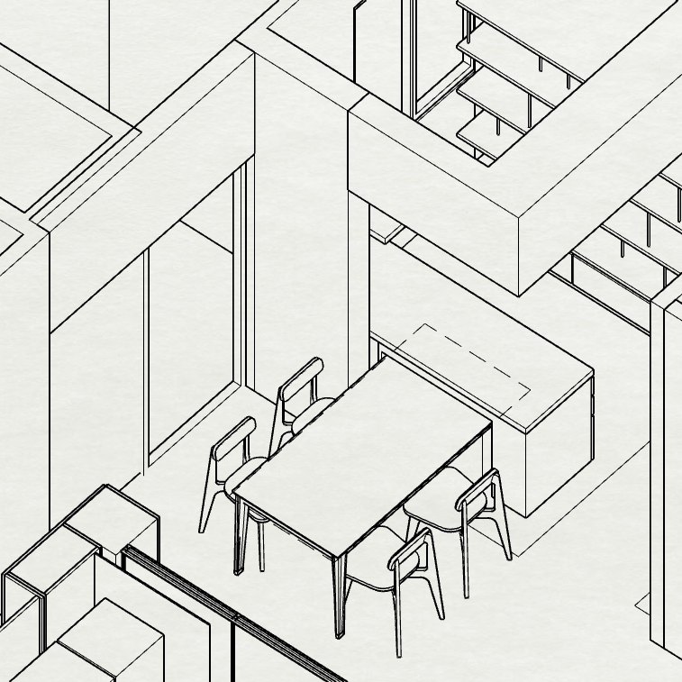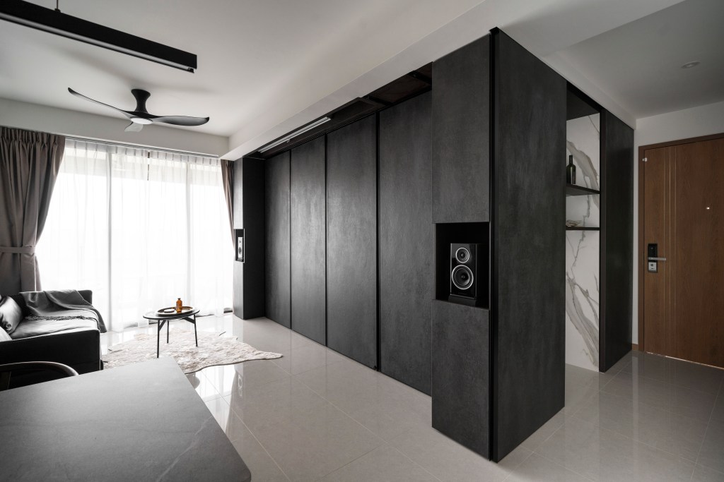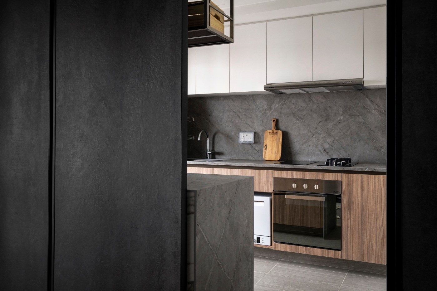 Sometimes we don’t want to do the same things all the time; a house could change depending on your needs. We designed flexible spaces with slide-and-park doors overlaid in seamless large-format tiles for a soft industrial look.