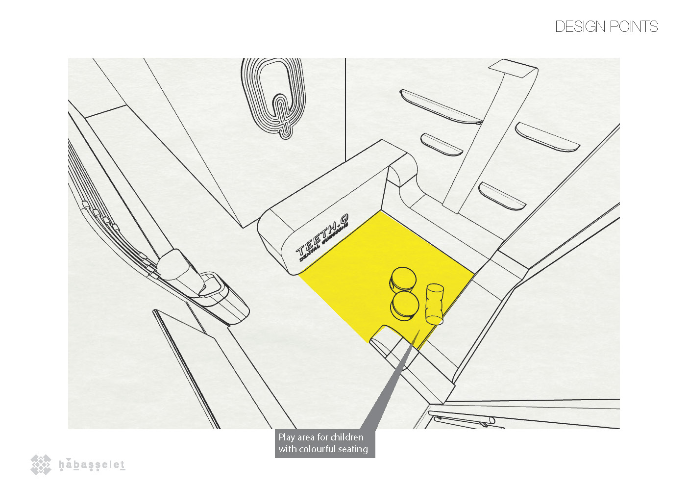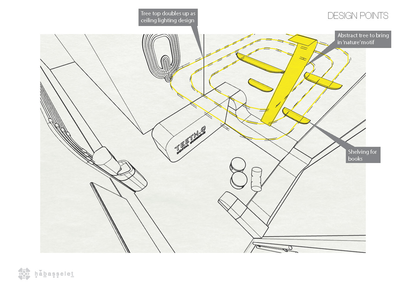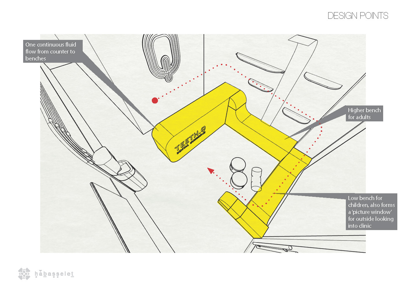 A playful and intimate space for a dental clinic, including a reading tree with integrated lighting and a play area for children. We sculpted a one-of-a-kind continuous concrete counter and bench, designed to seat both adults and kids.