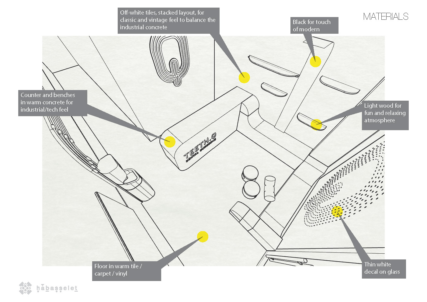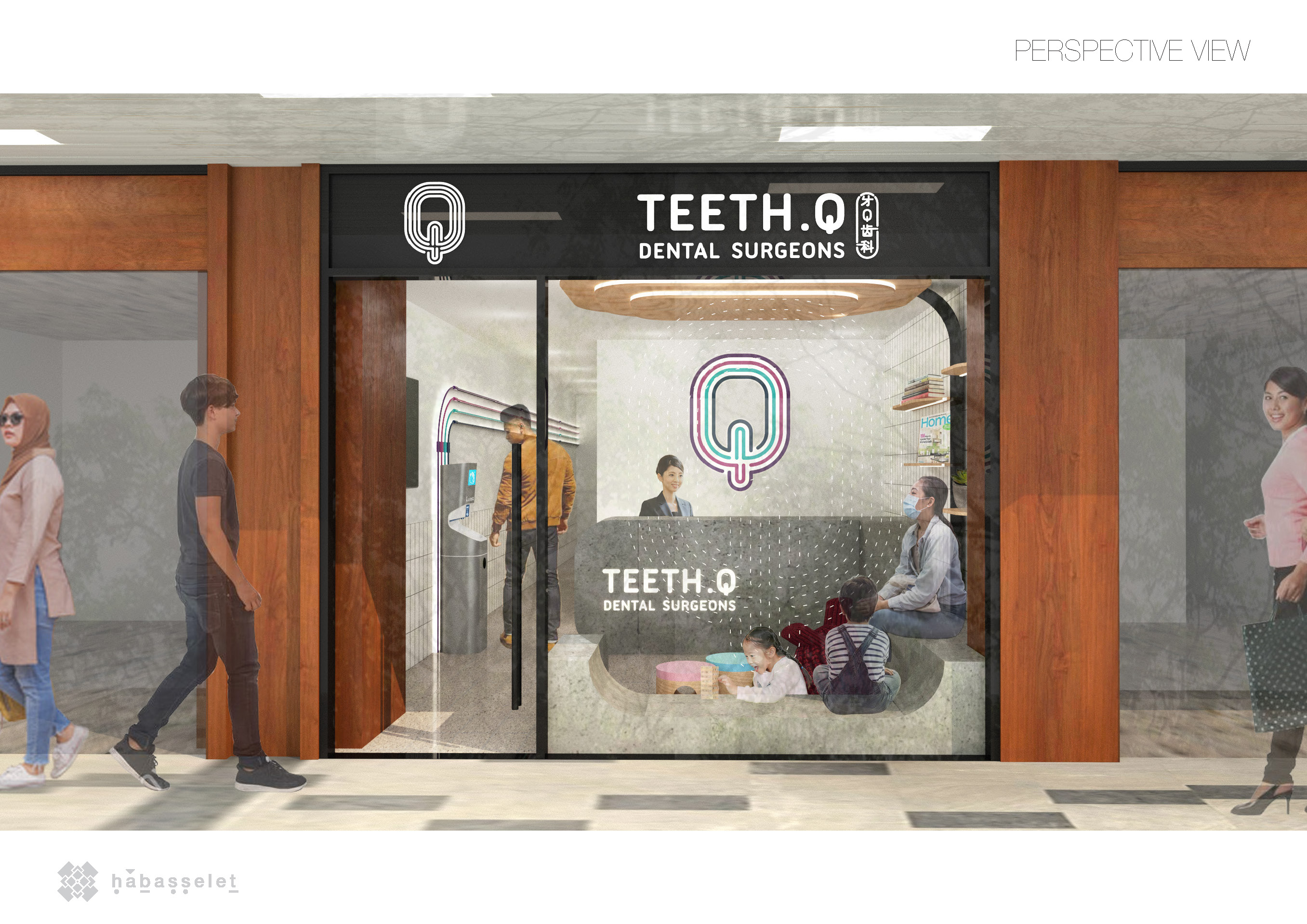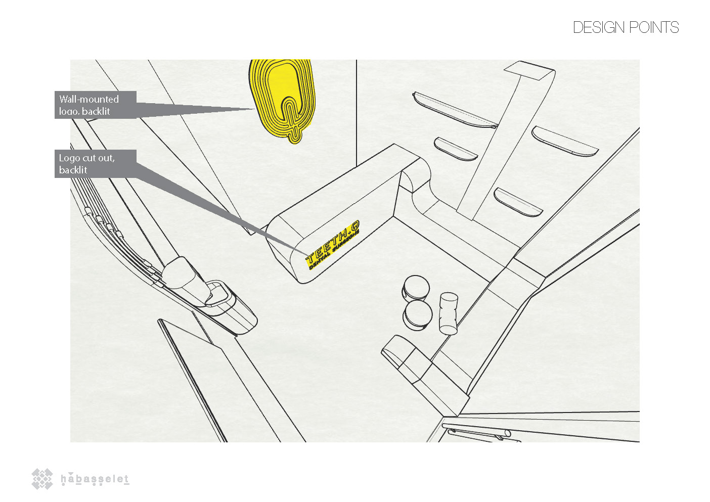 A playful and intimate space for a dental clinic, including a reading tree with integrated lighting and a play area for children. We sculpted a one-of-a-kind continuous concrete counter and bench, designed to seat both adults and kids.
